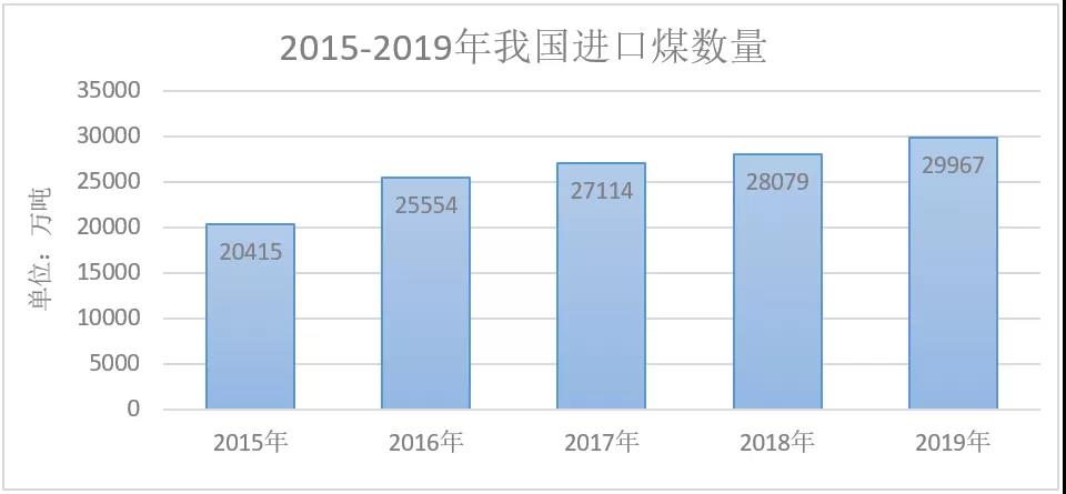 近年來(lái),國(guó)內(nèi)進(jìn)口煤數(shù)據(jù)逐年上升。國(guó)家統(tǒng)計(jì)局公報(bào)數(shù)據(jù)顯示,我國(guó)煤炭進(jìn)口從2015年20415萬(wàn)噸,逐年穩(wěn)步上升至2019年的29967萬(wàn)噸,增幅達(dá)46%。2019年全國(guó)原煤產(chǎn)量完成39.7億噸,同比增長(zhǎng)4.0%,而進(jìn)口煤同比增長(zhǎng)6.3%,進(jìn)口煤增速高于國(guó)內(nèi)煤產(chǎn)量。