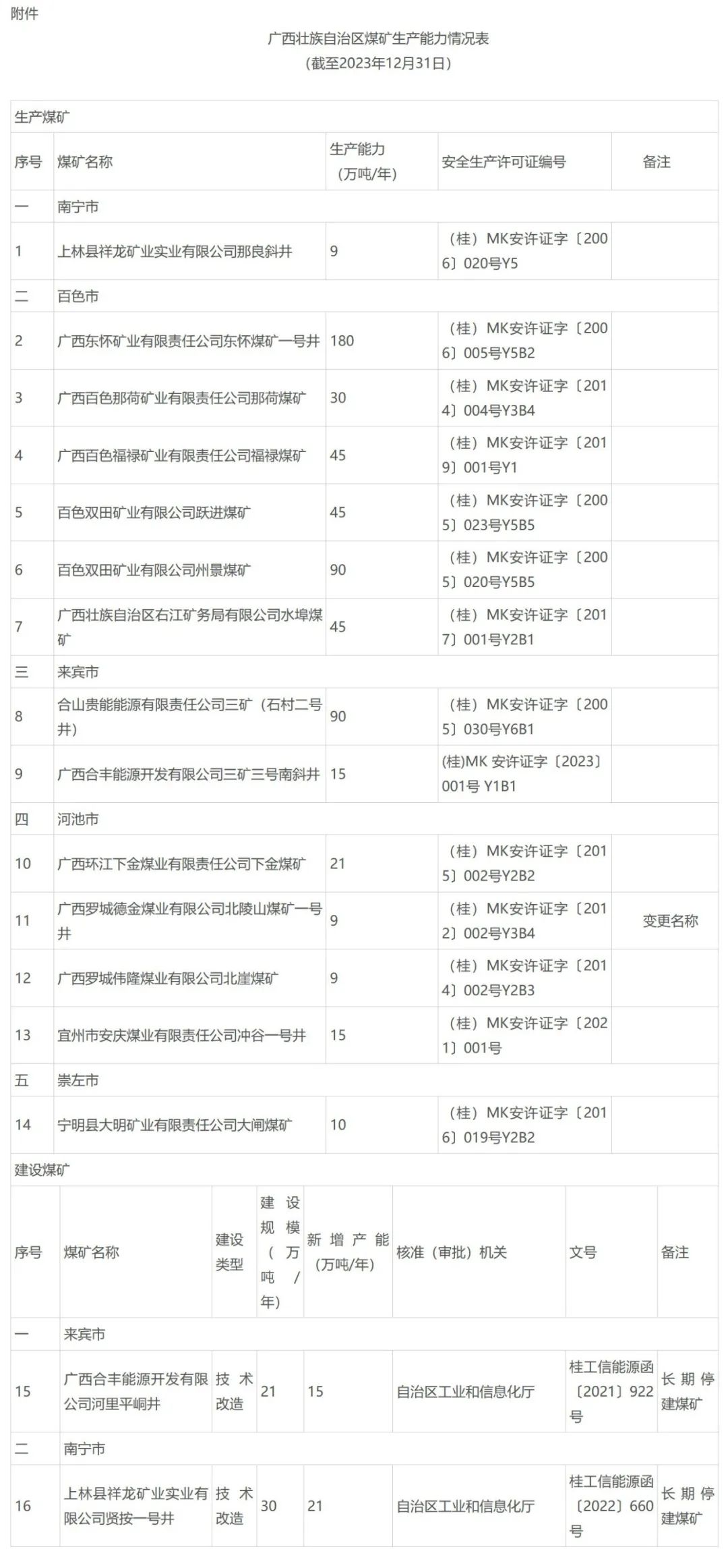 附件:廣西壯族自治區(qū)煤礦生產(chǎn)能力情況表