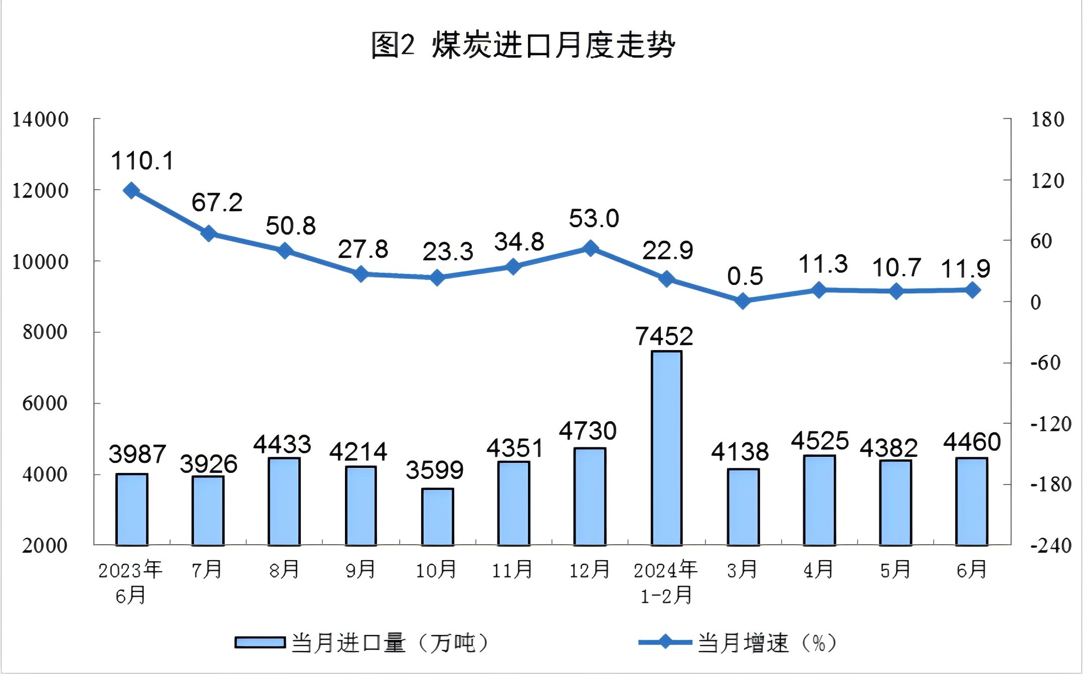根據(jù)國家統(tǒng)計局發(fā)布的數(shù)據(jù),2024年1-6月份進口煤炭2.5億噸,同比增長12.5%。6月份進口煤炭4460萬噸,同比增長11.9%,這一增長率較1-6月份的12.5%略有下降,但仍然顯示出煤炭進口量的穩(wěn)中有增,對煤炭的價格會行成一定的壓力。