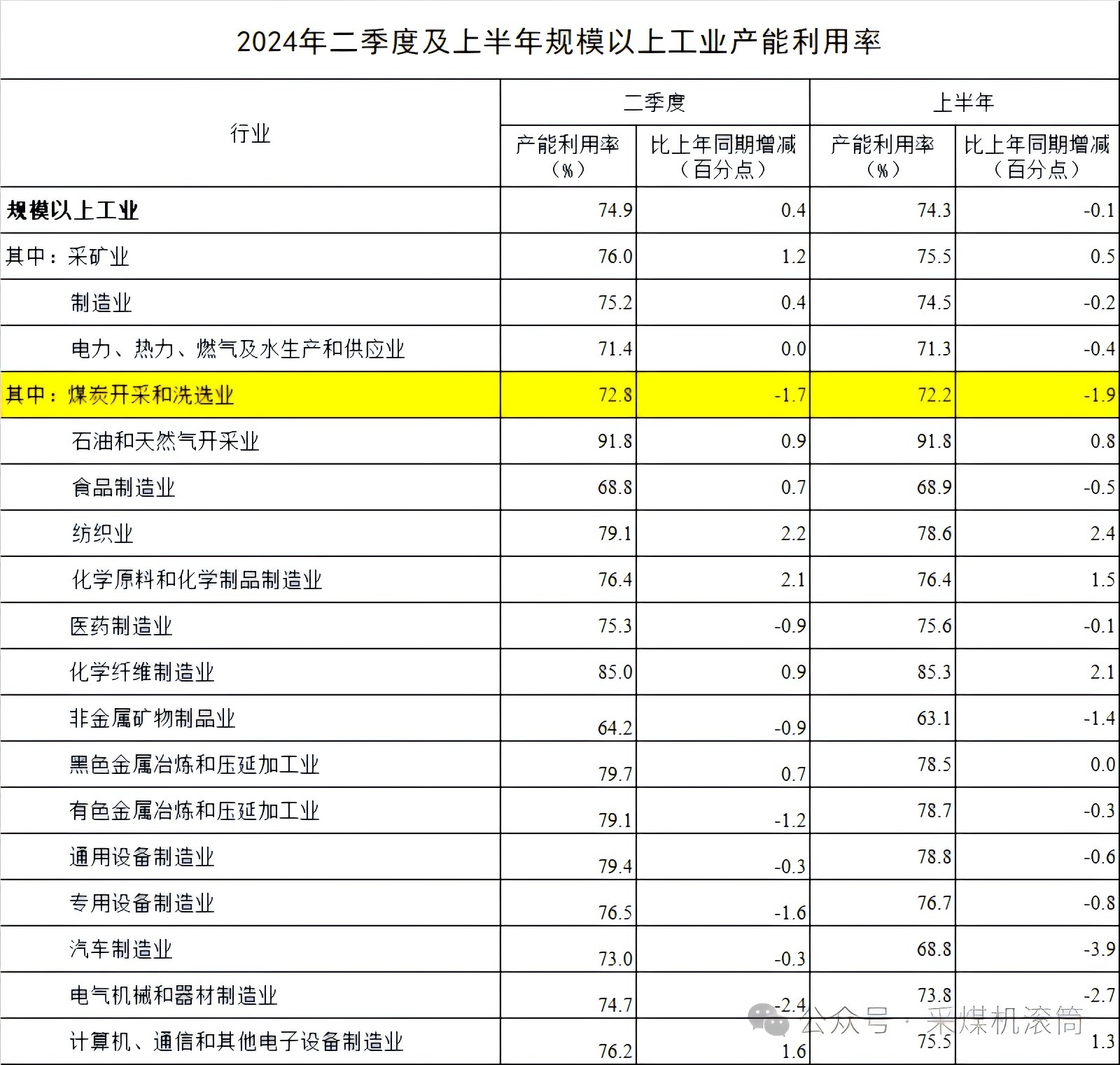國家統(tǒng)計局數(shù)據(jù)顯示,2024年二季度,煤炭開采和洗選業(yè)的產(chǎn)能利用率為72.8%,較上年同期下降了1.7個百分點。上半年整體產(chǎn)能利用率為72.2%,比上年同期下降了1.9個百分點,與煤炭產(chǎn)量呈現(xiàn)總體的正相關性。